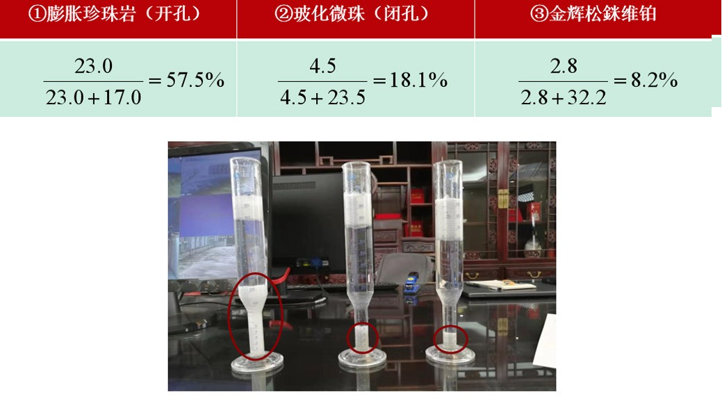 ——開孔珍珠巖/玻化微珠/金輝松銤維鉑沉降率對比試驗數據(20min沉降)——